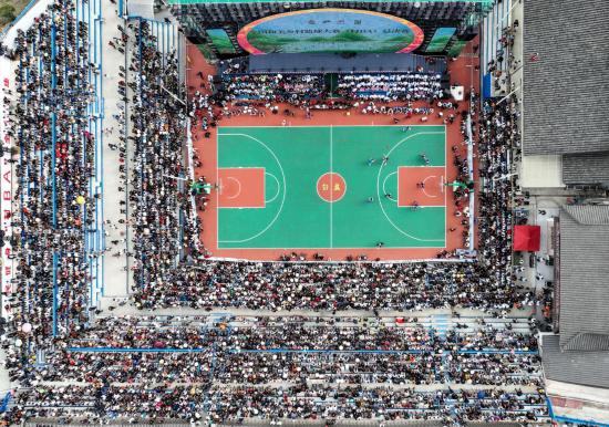 這是10月25日拍攝的全國(guó)和美鄉(xiāng)村籃球大賽(村BA)總決賽現(xiàn)場(chǎng)(無人機(jī)照片)。新華社記者 歐東衢 攝