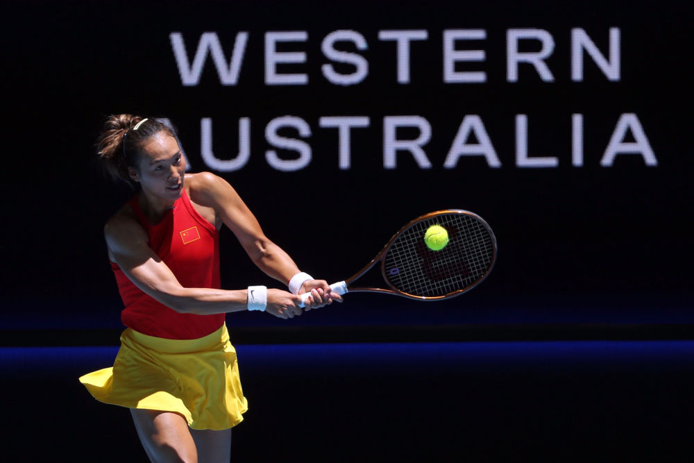 2023年12月30日,鄭欽文在2024年網(wǎng)球聯(lián)合杯E組小組賽女單比賽中。新華社發(fā)(周丹攝)