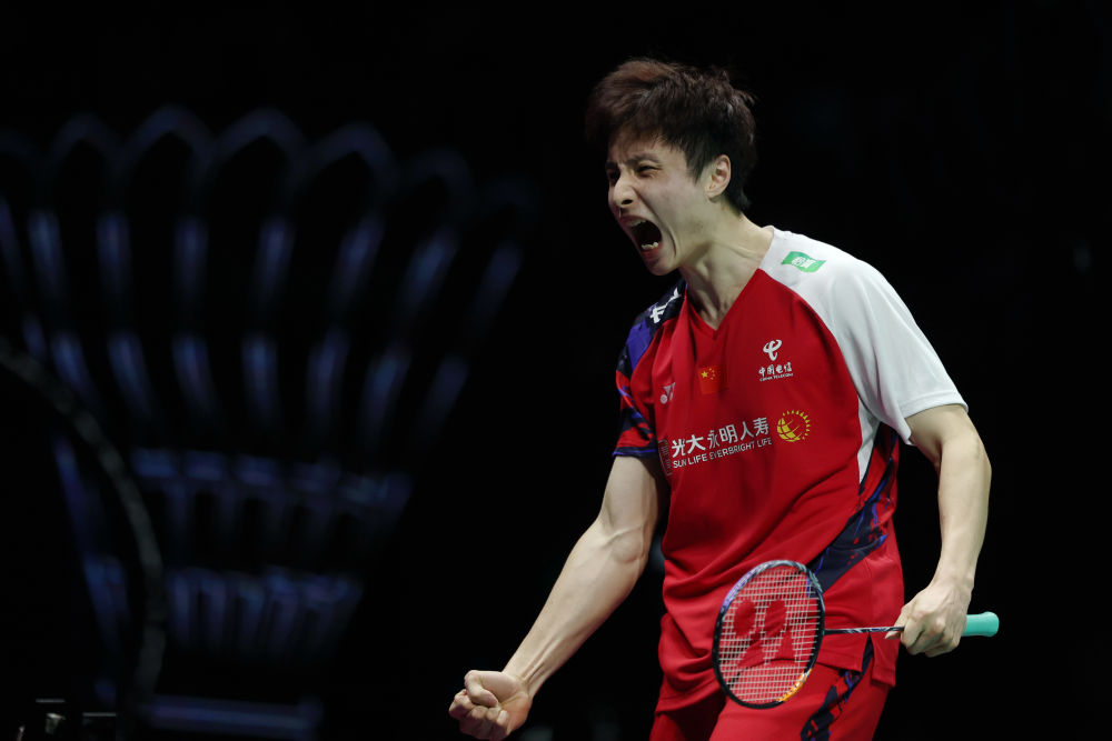 5月5日,中國隊選手石宇奇在男子單打比賽獲勝后慶祝。新華社記者 陳斌 攝