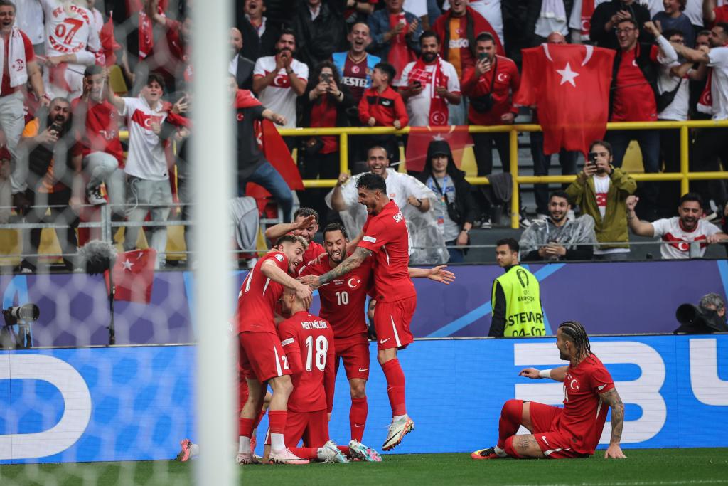 6月18日,土耳其隊球員梅爾特·穆爾杜爾(18號)進球后與隊友慶祝。新華社記者 潘昱龍 攝
