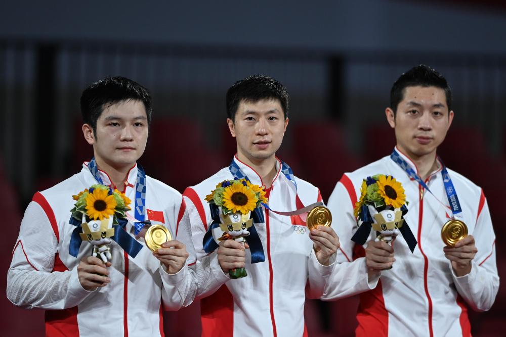 2021年8月6日,中國(guó)隊(duì)選手馬龍(中)、許昕(右)、樊振東在頒獎(jiǎng)儀式上。當(dāng)日,在東京奧運(yùn)會(huì)乒乓球男子團(tuán)體決賽中,中國(guó)隊(duì)以3:0的總比分戰(zhàn)勝德國(guó)隊(duì),奪得冠軍。新華社記者 黃宗治 攝