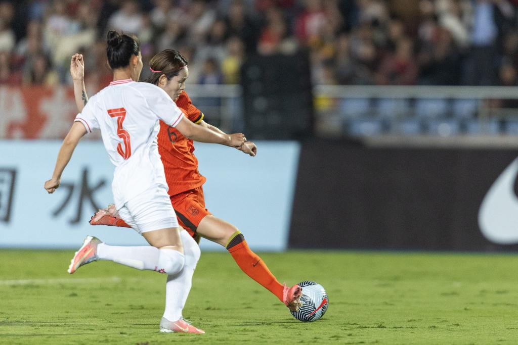 10月29日,中國(guó)隊(duì)球員張馨(右)在比賽中射門(mén)。新華社記者 黃偉 攝