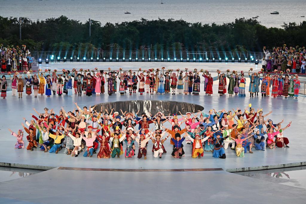 這是11月26日拍攝的聯(lián)歡晚會現(xiàn)場。當日,第十二屆全國少數(shù)民族傳統(tǒng)體育運動會民族大聯(lián)歡活動在海南省三亞市舉行。新華社記者 郭程 攝