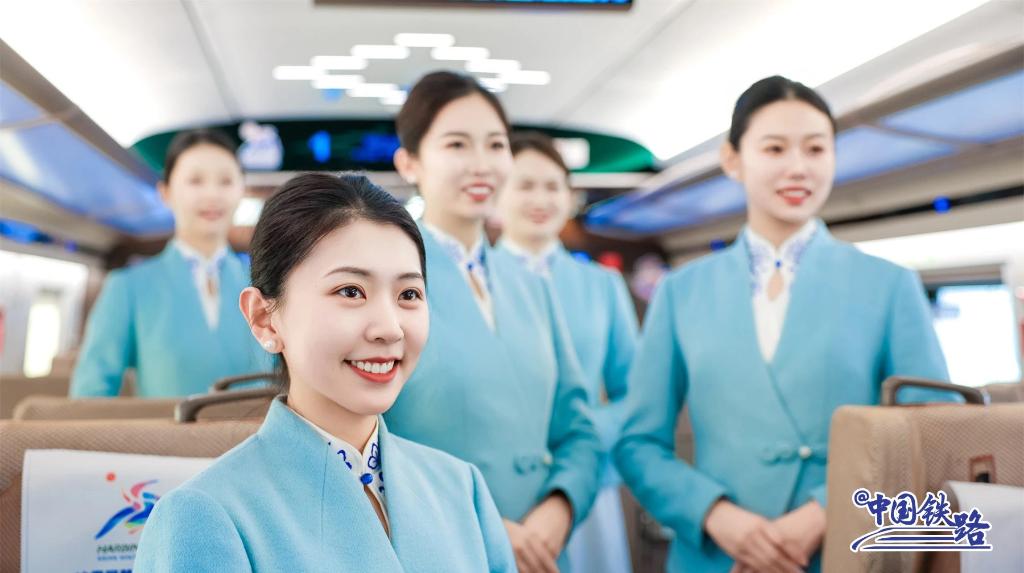 列車上,乘務(wù)員身著帶有雪花刺繡的藍白衣裙,熱情、得體地與乘客交流。車廂內(nèi)印有亞冬會元素的時刻表、貼紙隨處可見,營造出濃厚的冰雪體育盛會氛圍。