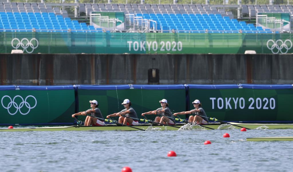 2021年7月20日,中國(guó)賽艇隊(duì)女子四人雙槳隊(duì)員在訓(xùn)練中。當(dāng)日,中國(guó)賽艇隊(duì)在日本東京海之森水上競(jìng)技場(chǎng)訓(xùn)練,備戰(zhàn)即將開(kāi)幕的東京奧運(yùn)會(huì)。新華社記者 杜瀟逸 攝