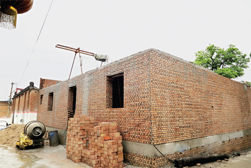7月20日上午,記者驅(qū)車來(lái)到忻府區(qū)解原鄉(xiāng)北趙村。在一個(gè)緊鄰村委會(huì)北側(cè)的逼仄巷子里,記者見(jiàn)到了這棟已經(jīng)停工的紅磚房。一層和地下室主體已經(jīng)建成,修葺齊整的墻面與周圍的土階茅屋形成了鮮明的對(duì)比,沙子、攪拌機(jī)堆放在旁邊,讓本就不寬敞的巷子顯得更加擁擠不堪。