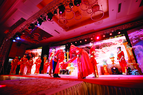 “秉父母之命,承媒妁之言,今日,新人喜結(jié)連理,諸賓共睹,天地同鑒,于此,新人三拜。一拜,感天地之造化,緣分天賜,德行地載。愿天地賜福,婚姻美滿,天長(zhǎng)地久。再拜,婚姻之意義,為延續(xù)生命,推進(jìn)文明。上以繼父母之血統(tǒng),下以開萬代之文化。三拜,今夕何夕,得此良人。愿此生忠貞不二,矢志不渝?!痹谔咸宵S河和大紅燈籠的映襯之下,一對(duì)身著中式婚禮服的新人隆重登場(chǎng)。鳳冠霞帔、紅花禮帽,古樸而莊重,喜氣又脫俗。民歌《想親親》道出了一對(duì)新人浪漫甜蜜的愛情故事,悠揚(yáng)嘹亮的嗩吶聲吹響了幸福的號(hào)角,一對(duì)甜蜜的新人在親朋好友的簇?fù)碇逻~入洞房。中式婚禮秀《想親親》讓現(xiàn)場(chǎng)的每一位觀眾感同身受,秀容大地的獨(dú)特風(fēng)俗文化在一場(chǎng)婚禮秀中體現(xiàn)得淋漓盡致。