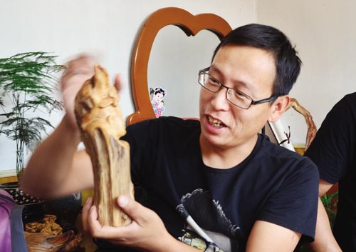 2008年,火苗參觀了在京城舉辦的一次大型美展,偶爾看到根雕大師鄭劍夫的作品,受到了深深的震撼。那仰天問道的老子、憂國憂民的屈原、舉杯邀明月的李白……神態(tài)細膩,形象逼真,惟妙惟肖,讓人緊緊盯著不愿離去。就這樣,火苗萌生了學習根雕的念頭。從此時開始,購買工具、收集資料、參觀展覽,根雕在他的心頭扎下了根。