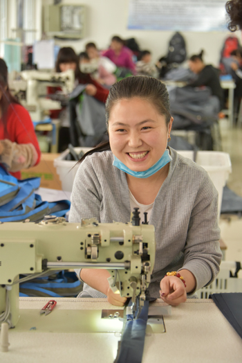 婦女們舉起加工好的背包,滿臉的自豪。