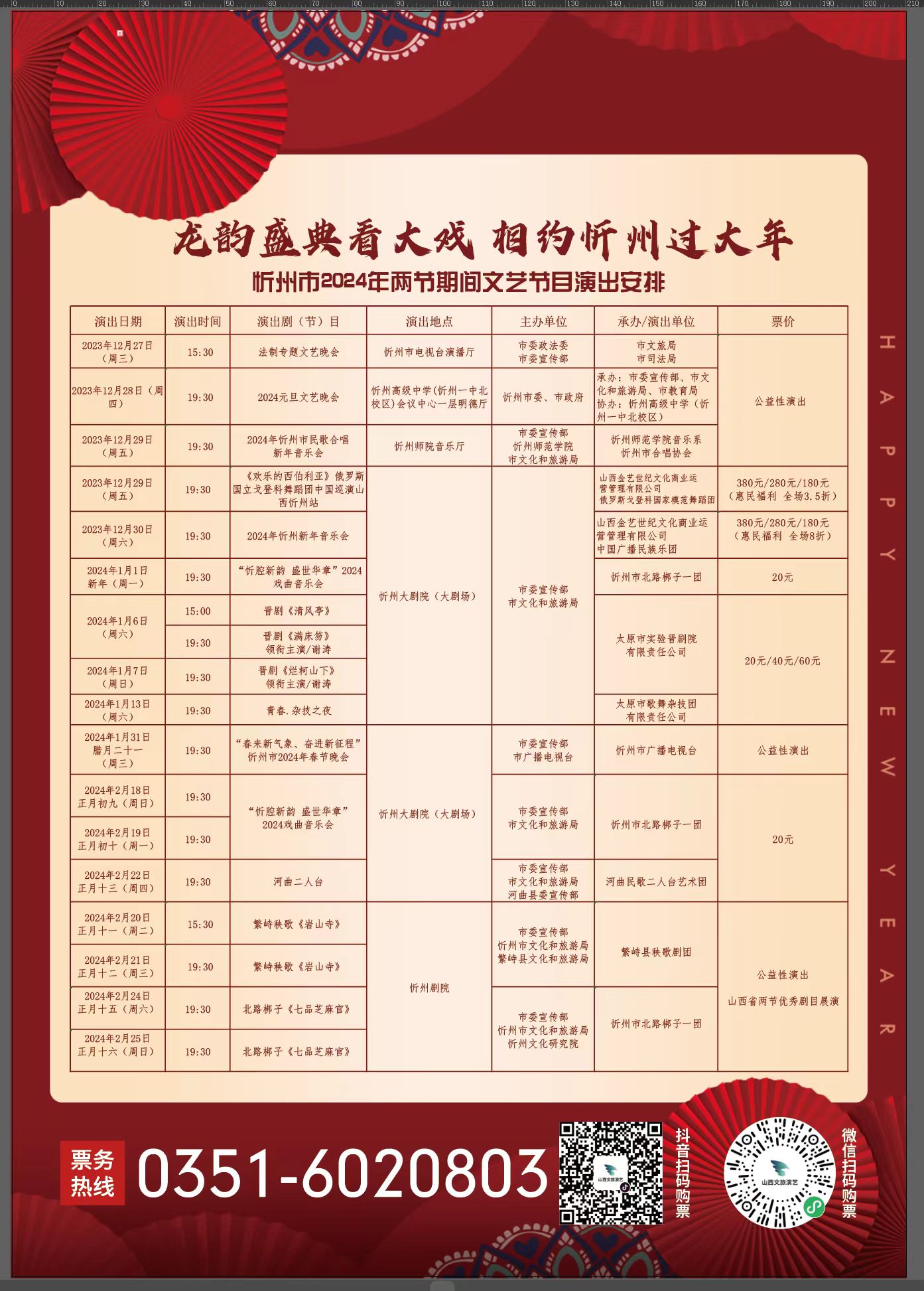 兩節(jié)期間文藝節(jié)目演出形式多樣、內容豐富,既有主題鮮明的文藝晚會,又有清新高雅的音樂會,既有本土戲曲、二人臺、秧歌展演,又有俄羅斯國力戈登科舞蹈團巡演,還有太原市歌舞雜技團帶來的精彩雜技表演,可謂亮點紛呈,好戲連臺。值得關注的是,在忻州劇院演出的繁峙秧歌《巖山寺》、北路梆子《七品芝麻官》為山西省兩節(jié)優(yōu)秀劇目展演,《巖山寺》于2024年2月20日、21日演出,《七品芝麻官》于2024年2月24日、25日演出。由市委政法委、市委宣傳部主辦,市文旅局、市司法局承辦的法制專題文藝晚會已于12月27日精彩上演,晚會通過人民群眾喜聞樂見的優(yōu)秀文藝作品全方位全景式展現(xiàn)了新時代精神氣象,正式拉開了我市2024年兩節(jié)期間文藝節(jié)目演出帷幕。我市兩節(jié)期間文藝節(jié)目演出時間將持續(xù)至2024年2月25日。