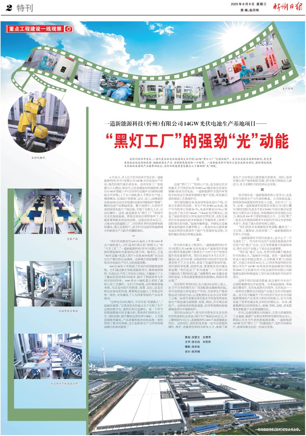 6月24日,步入位于忻州經(jīng)濟(jì)開發(fā)區(qū)的一道新能源科技(忻州)有限公司14GW光伏電池生產(chǎn)車間,強(qiáng)烈的現(xiàn)代感撲面而來。沒有傳統(tǒng)工廠的喧囂與人頭攢動(dòng),取而代之的是精密的機(jī)械韻律:數(shù)百臺AGV智能小車(自動(dòng)導(dǎo)引運(yùn)輸車)沿著預(yù)設(shè)路線無聲穿梭;上千臺六軸機(jī)器人手臂在生產(chǎn)線上精準(zhǔn)舞動(dòng),完成硅片的抓取、定位、加工;高精度的在線AOI(自動(dòng)光學(xué)檢測)設(shè)備如同敏銳的“眼睛”,瞬間完成產(chǎn)品瑕疵篩查。整個(gè)流程中,從原料開盒到高效電池片下線包裝,實(shí)現(xiàn)了全程無人化、自動(dòng)化操作。這里,就是被譽(yù)為“黑燈工廠”的現(xiàn)代化光伏制造基地。即使在夜間無照明條件下,也能依靠智能系統(tǒng)高效運(yùn)轉(zhuǎn)。這座總投資60億元、占地474畝的超級工廠,歷經(jīng)兩年多時(shí)間緊鑼密鼓的建設(shè),現(xiàn)已全面投產(chǎn),成為忻州這座傳統(tǒng)能源城市向新質(zhì)生產(chǎn)力躍升的耀眼地標(biāo)。