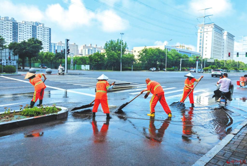 8月5日凌晨,我市降雨天氣造成城區(qū)部分道路路面積水。清晨,環(huán)衛(wèi)工人積極應(yīng)對雨情,對轄區(qū)內(nèi)路段開展排水清淤工作,保障市民日常出行。圖為環(huán)衛(wèi)工人在紫檀街路口清理積水。本報記者王陽攝