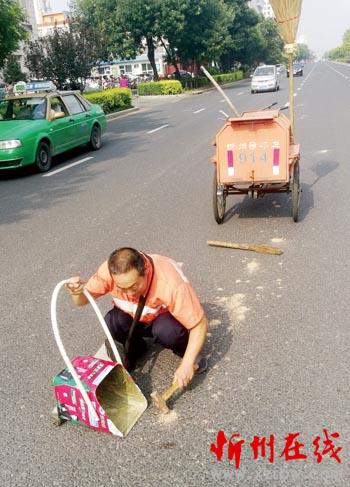 7月22日中午,忻州城區(qū)和平街,烈日當(dāng)頭,車水馬龍。這時(shí)記者看到在忻州師范學(xué)院路段,一位環(huán)衛(wèi)工人手執(zhí)小鐵錘,一絲不茍蹲在馬路上敲打撒落在路面上的粘泥,然后再用掃帚認(rèn)真清理干凈。這種敬業(yè)精神,值得大家學(xué)習(xí)。(赫在榮 攝)