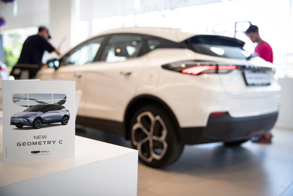 這是6月21日在以色列特拉維夫一家吉利銷售點拍攝的新款幾何C電動車型。當(dāng)日,吉利汽車在以色列發(fā)布新款幾何C電動車型。新華社記者 陳君清 攝