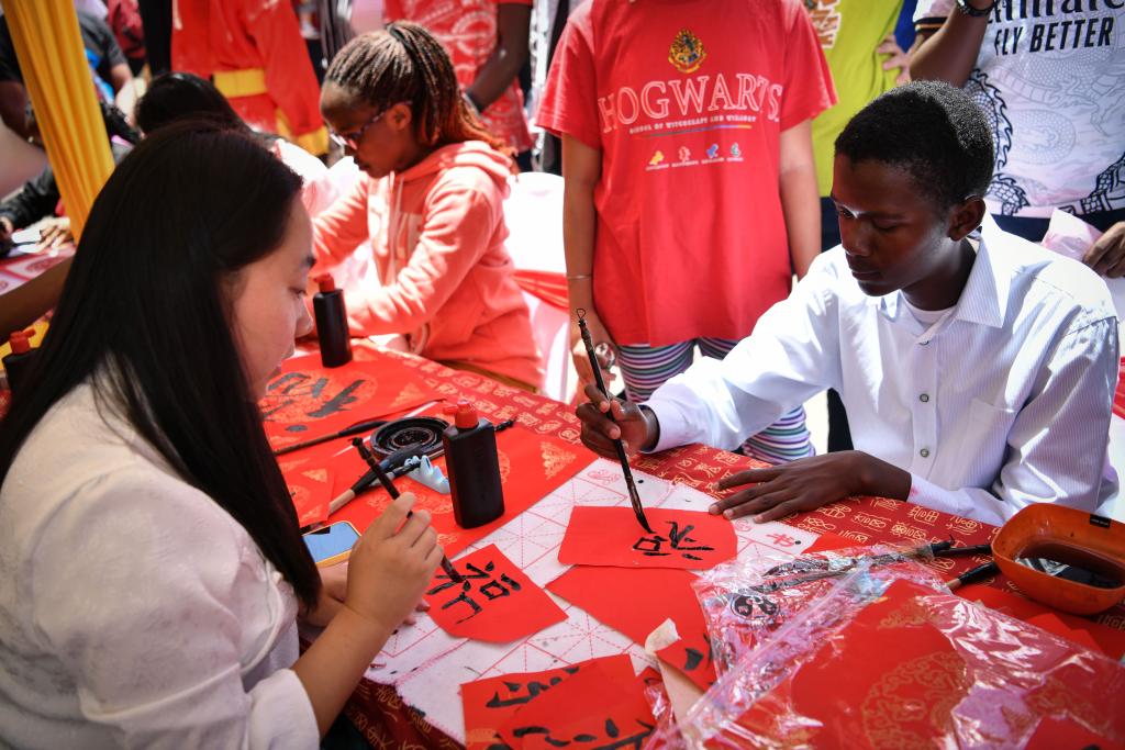 2月10日,在肯尼亞首都內(nèi)羅畢,人們在內(nèi)羅畢中國春節(jié)廟會上體驗(yàn)中國書法。(新華社記者韓旭 攝)