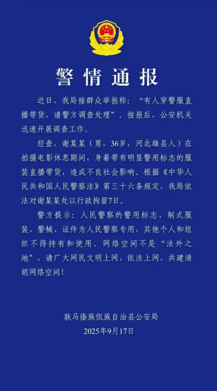近日,演員謝孟偉(網(wǎng)絡(luò)俗稱“嘎子哥”)在直播帶貨過程中身穿警服,被公安機(jī)關(guān)依法處以行政拘留七日的處罰。該處理結(jié)果獲得輿論普遍支持,體現(xiàn)出社會對公權(quán)力象征符號神圣性的共同維護(hù)。據(jù)通報(bào),謝某在電影拍攝休息期間,身著配有警用標(biāo)志的制式警服公開推銷電子產(chǎn)品,并聲稱“穿警服需通過政審”“公安機(jī)關(guān)應(yīng)當(dāng)配合工作”,企圖利用警服所承載的公信力為其商業(yè)行為背書。