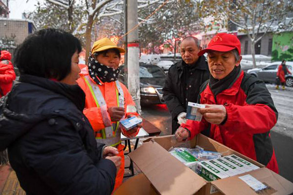 圖說(shuō):蔣愛(ài)榮(右一)為環(huán)衛(wèi)工人分發(fā)愛(ài)心人士捐贈(zèng)的感冒藥(11月23日攝)。圖片來(lái)源:新華社