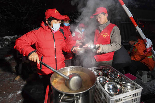 圖說(shuō):在鄭州市廣電南路愛(ài)心粥屋,志愿者在為環(huán)衛(wèi)工人分發(fā)早餐(11月23日攝)。圖片來(lái)源:新華社