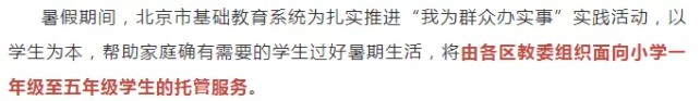 7月2日,北京市教育委員會(huì)表示,北京市各區(qū)教委將組織面向小學(xué)一年級(jí)至五年級(jí)學(xué)生的托管服務(wù)。