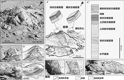 研究團(tuán)隊(duì)發(fā)現(xiàn),祝融段內(nèi)的巖石通常保留有局部呈透鏡狀的交錯(cuò)層理組構(gòu),以多種小型交錯(cuò)層理為主,伴隨少量透鏡狀壓扁層理和小型水道結(jié)構(gòu)的沉積構(gòu)造。其中,組成交錯(cuò)層理的層系在兩個(gè)相反的方向疊覆傾斜,指示雙向古水流環(huán)境。
