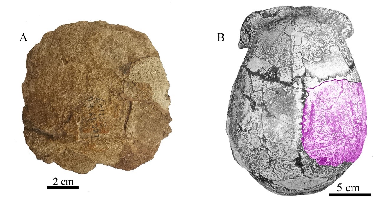 周口店第15號地點發(fā)現(xiàn)的人類頂骨化石。左側(cè):頂骨化石外側(cè)面觀;右側(cè):周口店直立人頭蓋骨模型頂面觀,示頂骨化石位置。中國科學(xué)院供圖