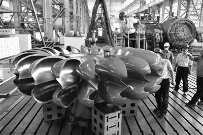 圖為東方電機(jī)國內(nèi)首臺自主研制的單機(jī)容量最大功率150兆瓦級沖擊式水電機(jī)組轉(zhuǎn)輪。 資料照片