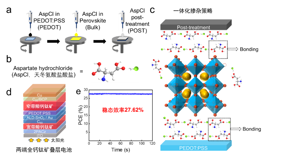 為此,研究團(tuán)隊(duì)將天冬氨酸鹽酸鹽引入到全鈣鈦礦疊層太陽能電池底部的空穴傳輸層、鈣鈦礦體吸光層和上界面層中,開發(fā)了一種采用同一分子處理的一體化摻雜策略,極大地改善了鈣鈦礦薄膜的質(zhì)量。除了與鈣鈦礦前驅(qū)體配位外,天冬氨酸鹽酸鹽分子還具有很強(qiáng)的分子間氫鍵,富集在鈣鈦礦上、下界面處的天冬氨酸鹽酸鹽因此充當(dāng)了鈣鈦礦層和傳輸層界面之間的分子鎖,進(jìn)一步提升了鈣鈦礦材料的性能和穩(wěn)定性。