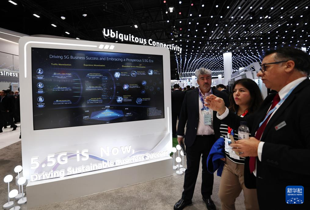 2月28日,在西班牙巴塞羅那舉行的2024年世界移動通信大會上,人們在華為展臺關(guān)注5G-A技術(shù)。新華社記者高靜 攝