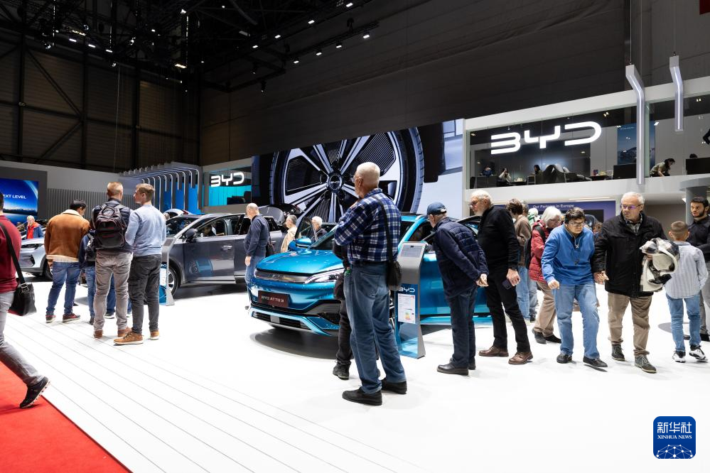 這是2月28日在瑞士日內(nèi)瓦舉行的2024年日內(nèi)瓦國際車展上拍攝的比亞迪展臺。新華社記者孟鼎博 攝