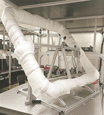 薩格納克干涉儀2公里長的光纖纏繞在邊長1.4米的方形鋁制框架上。圖片來源:奧地利維也納大學(xué)
