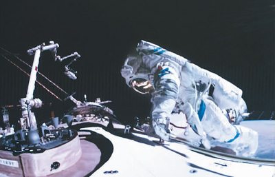 12月21日在北京航天飛行控制中心拍攝的神舟十七號(hào)航天員唐勝杰開展艙外操作的畫面。韓啟揚(yáng)攝(新華社發(fā))