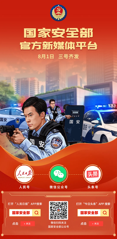 今天,國(guó)家安全部頭條號(hào)、人民號(hào)正式上線了。這是國(guó)家安全機(jī)關(guān)新的官方權(quán)威宣傳陣地,與國(guó)家安全部官微共同打造國(guó)家安全部官方新媒體平臺(tái)。歡迎大家關(guān)注國(guó)家安全部官方微信公眾號(hào)、國(guó)家安全部頭條號(hào)、國(guó)家安全部人民號(hào),感受隱蔽戰(zhàn)線的“神秘”工作、“神奇”事業(yè)、神圣使命!