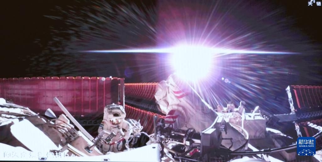 1月20日在北京航天飛行控制中心拍攝的神舟十九號(hào)航天員蔡旭哲(右)、宋令東(左)在空間站組合體艙外工作的畫面。新華社記者 劉芳 攝