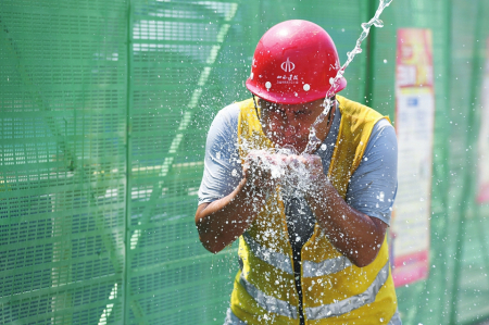 7月11日,入伏第一天。在太原市杏花嶺區(qū)文化活動(dòng)中心項(xiàng)目施工現(xiàn)場,工人師傅們?cè)诟邷叵伦鳂I(yè)。圖為一位剛下工的師傅,用涼水沖臉,解暑降溫。山西晚報(bào)記者 武六紅攝