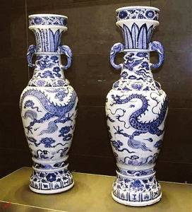 大維德花瓶可能是現(xiàn)存最重要的青花瓷器物,其頂部附近的銘文表明它們的年代可以追溯到1351年。1935年,珀西瓦爾·大維德爵士分別從兩個(gè)收藏家手中買下它們,令這對(duì)花瓶重聚。