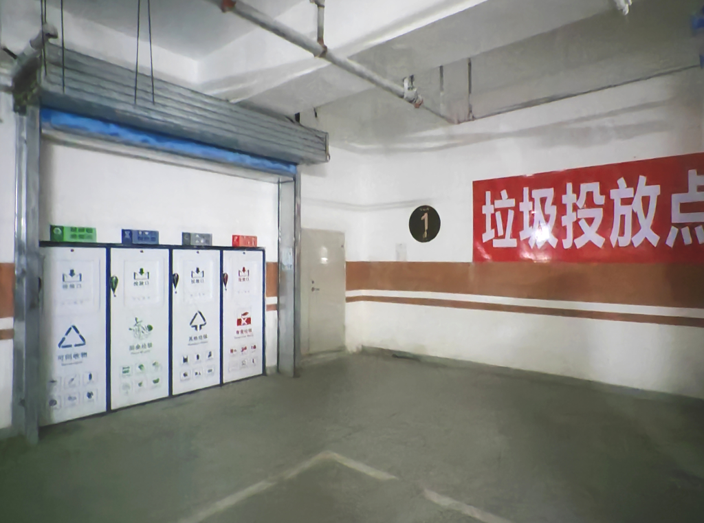 樹華園小區(qū)里沒有地面垃圾桶,只在一些日常人流密集區(qū)域設(shè)置有果皮箱和垃圾回收機。小區(qū)共有36棟住宅樓,按照每三到五棟樓為一個組團,在地下停車場集中設(shè)置了垃圾分類投放點。
