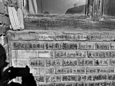 2024年春天,78歲的張福青過世了。那時(shí),環(huán)游中國的攝影師蔡山海,路過代縣上高陵村,恰巧碰上從外地趕回老家的張宏剛、張宏英為剛過世的父親舉行葬禮。他被葬禮上的鑼鼓聲吸引,走進(jìn)院子時(shí),卻被寫滿院子的文字震撼到。隨后,蔡山海用相機(jī)拍下那些寫在紅磚墻、木門窗上的文字,并發(fā)在“小紅書”上,隨即走紅網(wǎng)絡(luò)。