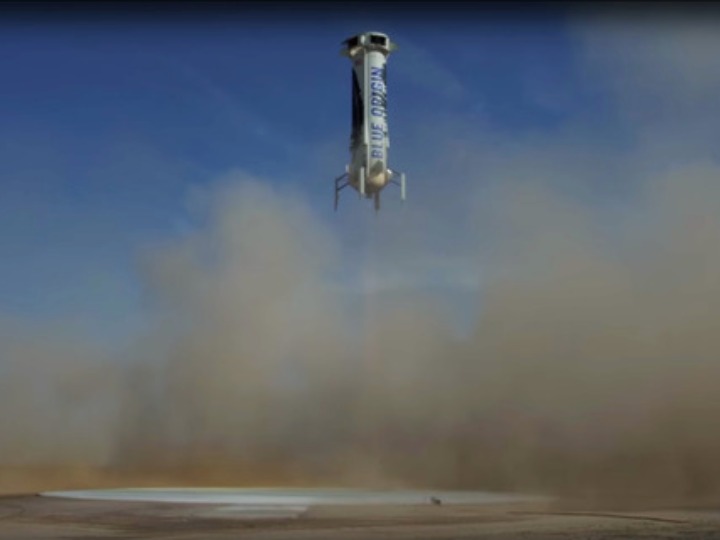 這張2016年6月19日的視頻截圖顯示,美國(guó)藍(lán)色起源公司“新謝潑德”火箭準(zhǔn)備在美國(guó)得克薩斯州范霍恩附近的試驗(yàn)場(chǎng)著陸。(新華社/美聯(lián))