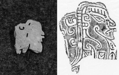 其中一件玉石上陽刻的側(cè)身人像,頭戴冠帽、橄欖形眼、高鼻梁、大嘴巴,生動的形象和精美的工藝與長江中游后石家河文化中的玉人(神)像如出一轍。
