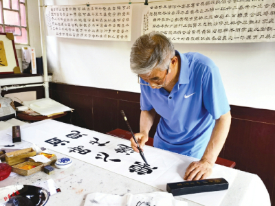 交城卦山書院有“山西姥爺”王朝珠的工作室,在墨香與花香中,山西晚報(bào)記者講起“山河+”客戶端的發(fā)展,說起2004年其兄長(zhǎng)王朝瑞先生贈(zèng)送墨寶的來歷,王朝珠老先生感嘆這份情意和緣分,便揮毫潑墨,接連寫下書法作品饋贈(zèng)山西晚報(bào)。特別是在“山河+鄰聚里”隸書中,加蓋了剛剛制印好的“山西姥爺”篆書印章,告訴記者“這枚印章還是第一次啟用咧?!?/p>