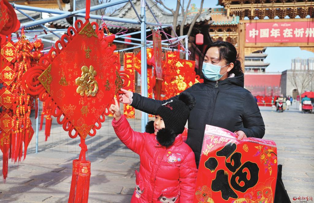 春節(jié)臨近,我市各大商場(chǎng)和年貨市場(chǎng)洋溢著濃濃的年味兒。春聯(lián)、“福”字、“中國(guó)結(jié)”等賀歲商品琳瑯滿目,到處都是紅紅火火的過年氣氛。右圖為2月3日,市民在忻州古城南北大街集市上選購年貨。 (張存良 攝)