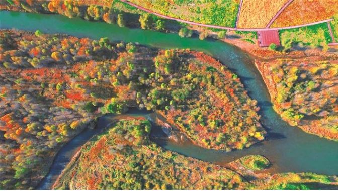 10月14日,航拍鏡頭下的靜樂汾河川國家濕地公園,秋意濃濃,景美如畫。 本報(bào)記者 張存良攝