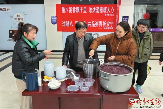活動(dòng)當(dāng)天,社區(qū)工作人員對(duì)現(xiàn)場(chǎng)認(rèn)真消毒后,就開始熬粥:淘洗糯米,去除蓮心,把蜜棗切成小塊,再放入紅豆、桂圓、冰糖等多種食材,慢慢熬煮后,軟糯香甜的紅豆粥完成了?!昂壬弦煌霟岷鹾醯奶鹬啵睦镆矡岷鹾醯?。”環(huán)衛(wèi)工人李大媽開心地說。