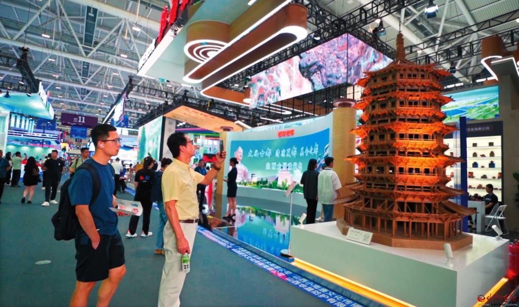 山西晟龍木雕模型藝術有限公司制作的應縣木塔模型一亮相,便吸引了眾多觀展游客的目光。精美絕倫的造型引得人們嘖嘖稱奇,紛紛拿出手機拍照記錄分享。該模型高約3米,最大直徑1.9米,通過20∶1的比例微縮打造,復刻了應縣木塔的榫卯結(jié)構(gòu),其內(nèi)部樓梯扶手清晰可見,門窗都能打開?!拔覀兊倪@件展品,是由二十多個師傅經(jīng)過半年多的時間完成的。這次為了來深圳參展,我們專門把它從定襄裝運發(fā)車,用了整整兩天半的時間才送到,跨越了將近兩千公里?!痹摴究偨?jīng)理張艷峰告訴記者。
