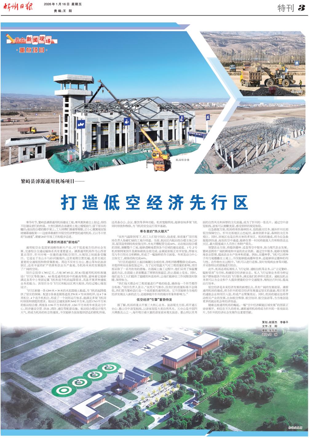 寒冬時節(jié),繁峙縣滹源通用機場建設工地,寒風裹挾著塵土掠過,卻擋不住建設者們的熱情。大型壓路機在凍硬的土地上緩緩前行,留下堅實的轍??;航站綜合樓的腳手架上,工人師傅們裹著厚棉服,正小心翼翼地安裝玻璃幕墻框架——這座承載著忻州低空經(jīng)濟夢想的通用機場,正以冬日里的“加速度”,朝著2027年竣工目標穩(wěn)步邁進。