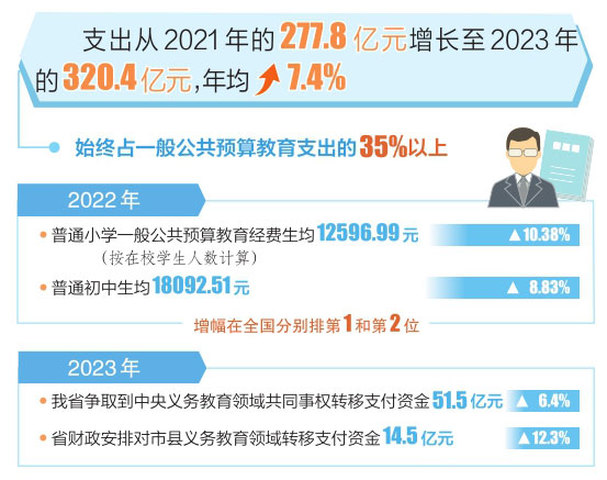 本報訊(記者任志霞)6月13日,記者從省財政廳獲悉,全省義務(wù)教育支出從2021年的277.8億元增長至2023年的320.4億元,年均增長7.4%,始終占一般公共預(yù)算教育支出的35%以上,義務(wù)教育優(yōu)質(zhì)均衡發(fā)展得到切實保障。