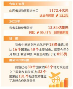牢記殷殷囑托,奏響開放強(qiáng)音。當(dāng)前,全省上下牢記習(xí)近平總書記殷殷囑托,堅(jiān)定不移推進(jìn)更高水平對外開放,著力優(yōu)化開放布局、推進(jìn)制度型開放、促進(jìn)對外貿(mào)易擴(kuò)量提質(zhì)、提升開放平臺(tái)能級(jí)、建設(shè)開放通道、提升投資貿(mào)易便利化、加強(qiáng)開放創(chuàng)新能力合作,加快構(gòu)建起多元發(fā)展、多點(diǎn)支撐的全面開放新格局,作為內(nèi)陸省份,山西對外開放的力度越來越大。