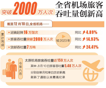 做足“增量篇”,各項(xiàng)生產(chǎn)指標(biāo)再創(chuàng)新高。今年以來,山西航產(chǎn)集團(tuán)乘勢(shì)而上,統(tǒng)籌發(fā)展,三大民航運(yùn)輸生產(chǎn)指標(biāo)屢創(chuàng)新高。截至12月10日,全省機(jī)場(chǎng)累計(jì)完成運(yùn)輸起降16萬架次、旅客吞吐量突破2000萬人次、貨郵吞吐量7萬噸,較2023年同比增長4.89%、14.93%、24.41%。尤其是在今年8月,太原機(jī)場(chǎng)旅客吞吐量近159萬人次,其中8月10日旅客吞吐量5.48萬人次,分別創(chuàng)單月和單日歷史新高,刷新了通航以來最高紀(jì)錄。