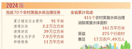 我省對(duì)農(nóng)村生態(tài)環(huán)境治理工作高度重視,2024年政府工作報(bào)告提出,要“完成50個(gè)農(nóng)村黑臭水體治理任務(wù)”。一年來(lái),我省各級(jí)各部門(mén)積極投入力量,挖掘打通資源,用心用情用力辦好這一民生實(shí)事。生態(tài)環(huán)境部門(mén)更是自加壓力,完成了70個(gè)農(nóng)村黑臭水體治理任務(wù),累計(jì)鋪設(shè)污水管網(wǎng)91千米,清理垃圾2.2萬(wàn)立方米,清理淤泥39萬(wàn)立方米,修建生態(tài)護(hù)岸7.9萬(wàn)平方米,種植植物11萬(wàn)平方米,促進(jìn)重點(diǎn)關(guān)注水體所在村莊生態(tài)環(huán)境質(zhì)量明顯改善,并以標(biāo)志性成果讓農(nóng)民群眾對(duì)治理效果可感可及,真正讓農(nóng)村黑臭水體治理工程成為普惠的民生工程。