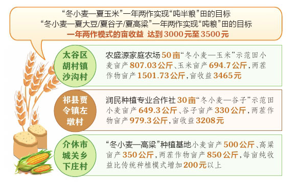 令人欣喜的是,實踐給出了響亮而積極的回答。我省“冬小麥—夏玉米”一年兩作實現(xiàn)“噸半糧”田的目標(biāo),“冬小麥—夏大豆/夏谷子/夏高粱”一年兩作實現(xiàn)“噸糧”田的目標(biāo),一年兩作模式的畝收益達到3000元至3500元。太谷區(qū)胡村鎮(zhèn)沙溝村農(nóng)盛源家庭農(nóng)場50畝“冬小麥—玉米”示范田小麥畝產(chǎn)807.03公斤、玉米畝產(chǎn)694.7公斤,兩茬作物畝產(chǎn)1501.73公斤,畝收益3465元。祁縣賈令鎮(zhèn)左墩村潤民種植專業(yè)合作社30畝“冬小麥—谷子”示范田小麥畝產(chǎn)649.3公斤、谷子畝產(chǎn)330公斤,兩茬作物畝產(chǎn)979.3公斤,畝收益3208元。介休市城關(guān)鄉(xiāng)下莊村“冬小麥—高粱”種植基地小麥畝產(chǎn)500公斤、高粱畝產(chǎn)350公斤,兩茬作物畝產(chǎn)850公斤,每畝純收益比傳統(tǒng)種植模式增加200元以上。
